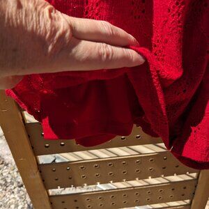 Red eyelet crop top & shorts set. Top has adjustable straps, elastic at the top & bottom and is lined in the front. Shorts have an elastic drawstring waist & are lined.