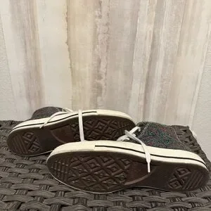 These Converse sneakers feature a sleek black high-top design, complete with the iconic star logo patch on the ankle. The shoes boast a classic white toe cap and rubber midsole, ensuring both style and comfort. Perfect for any casual occasion, these sneakers embody the timeless Converse aesthetic.