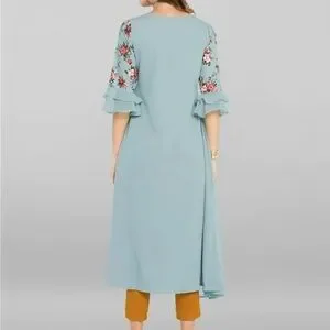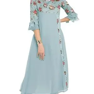 Elegant blue dress with floral embroidery, perfect for any occasion. Features a stylish design with intricate details.