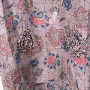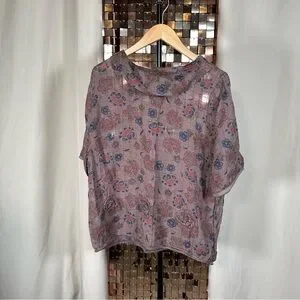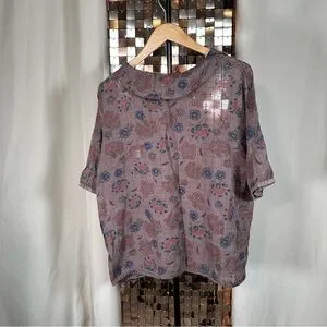 Vintage Purple, Maroon & Navy Checked Plaid & Floral Short Sleeve Sheer Blouse