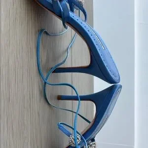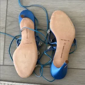 These exquisite Manolo Blahnik sandals showcase a vibrant blue hue adorned with metallic spherical beads along the delicate straps. The slide-style design and luxurious leather insole offer both elegance and comfort, making them a standout choice for any sophisticated occasion.
