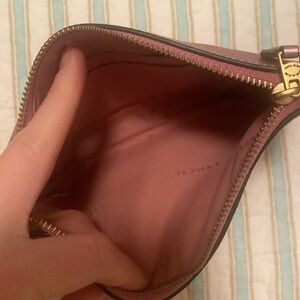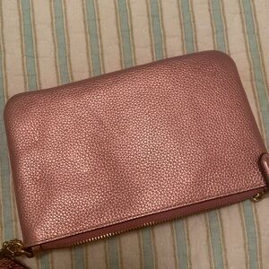 This Coach wristlet in a stunning pink metallic finish combines elegance with practicality. Its sleek design and convenient wrist strap make it an ideal accessory for carrying essentials with style. Perfect for adding a touch of sophistication to any outfit.