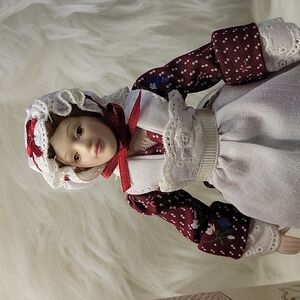 Delightful porcelain doll featuring a red and white bonnet, polka dot blouse, and green skirt. Includes a decorative box.