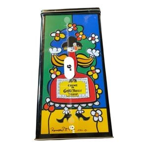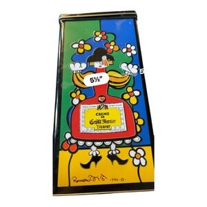 This is a vintage Creme de Grand Marnier collectible tin from 1990, featuring artwork by pop artist Romero Britto. The tin was made in England. It is a lithographed tin, which means the design was printed using a special process that gives it a high-quality look