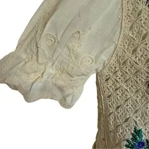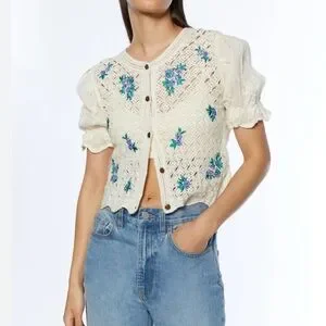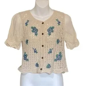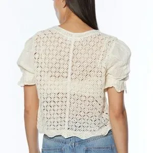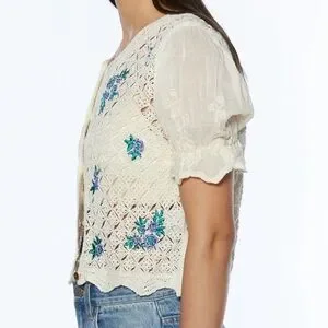 The vintage-inspired button front cardigan has a crochet knit design with floral details, a scalloped hem and puff sleeves. A style to wear with summer over a mini dress or with jeans shorts.
