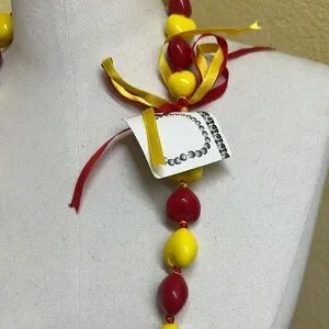 Add a pop of color to your outfit with this vibrant red and yellow Kukui nut lei necklace. Perfect for any occasion, especially for that special graduate.