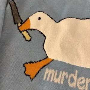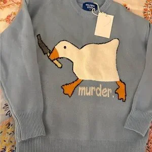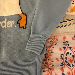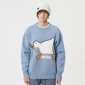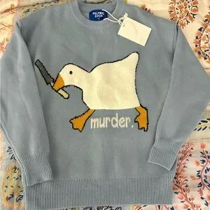 The Aelfric Eden Long Sleeve Goose Novelty Knit Sweater in Men's size s is a fun and stylish streetwear piece perfect for casual occasions and travel. Made from a blend of polyester, nylon, and acrylic, this tight-knit sweater features a solid blue color with a crew neck and long sleeves. The sweater showcases a playful animal cartoon theme with a goose design, making it a unique addition to your winter, fall, or spring wardrobe. Easy to care for with machine washable fabric, this pullover sweater offers a regular fit for comfort and style. New with tags. One snag- see image of thread