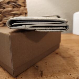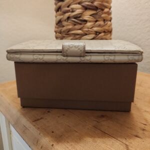 Beautiful Gucci Cream/Beige 2-sided Flap Wallet in Excellent Used Condition!!! Front pocket under Flap & under the backside snap there is a 2 piece divider & 8 card slots. This wallet is absolutely gorgeous!!! Callouts are a little wear around the edges, color transfer from the gold hardware under front flap & she could probably use a little cleaning! Measurements are 7.5" width × 4" length. Smoke-free home.