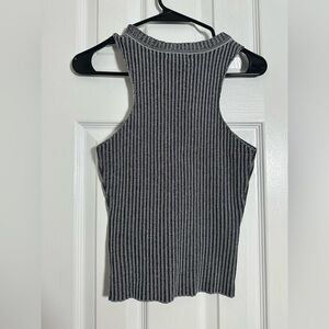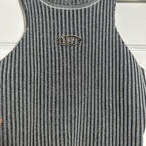 This fitted tank top features a stylish ribbed texture in a classic white and gray color palette. Its sleeveless design makes it a versatile addition to any wardrobe, perfect for layering or wearing on its own.