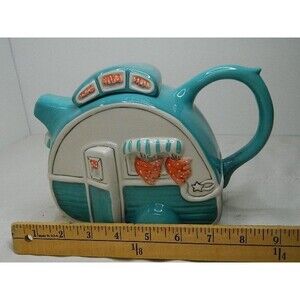 Blue Sky Retro Camper Teapot by Heather Goldmine Teal Camper Trailer 6"H Ceramic