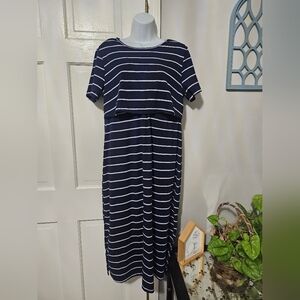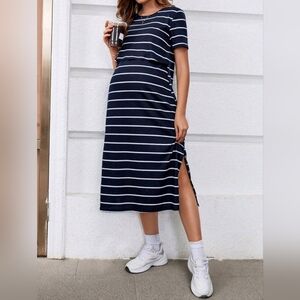 SHEIN Blue and White Maternity Sheath Midi Dress with Crew Neck