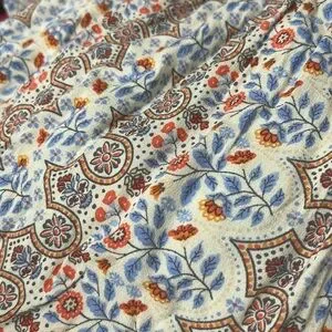 This dress is a creamy color with vibrant oranges, blues, gold, brown and red.