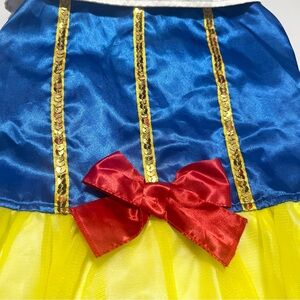The product is a Snow White pet costume designed dogs and pets that fit the measurements. Made from polyester material in a multicolor theme, this Halloween cosplay costume from Michael's is perfect for dressing up your furry companion in a cute and festive way. Ideal for any Princess loving pet owner looking to add a touch of whimsy to their Halloween celebrations, this costume is sure to make your pet stand out in any costume parade or party. Made in China, this high-quality costume will make your pet look adorable while ensuring comfort and style.