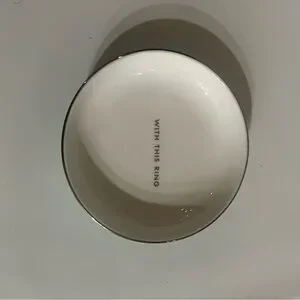 Beautiful teal and cream ring dish. Features 'WITH THIS RING' text. Perfect for jewelry display.
