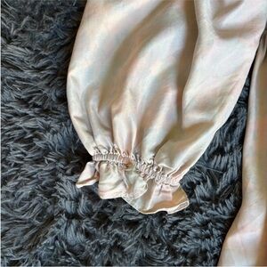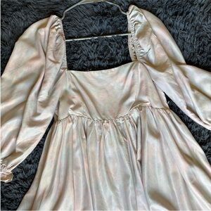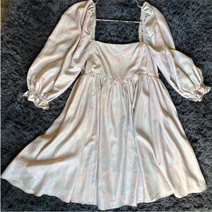 Elegant dress with a multicolor and cream shimmer. Features puffy sleeves for a classic look. Ideal for special occasions. Worn once