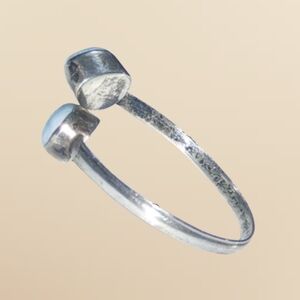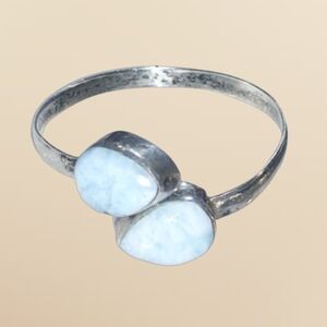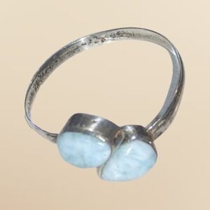Handmade bypass-style ring featuring two natural larimar cabochons in a minimalist open design. The soft blue stones show natural variation and are bezel-set in a simple, organic style that sits comfortably on the finger.
