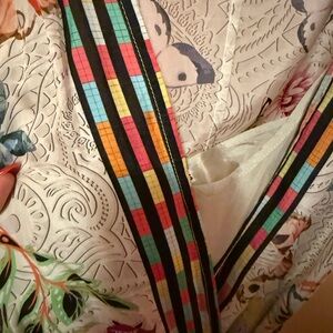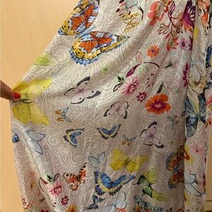 Vibrant floral sleeveless dress featuring colorful butterflies and striped accents throughout. This stunning Silk maxi dress is light weight and perfect for an elegant summer glow. The wrap dress also has pockets on both sides.