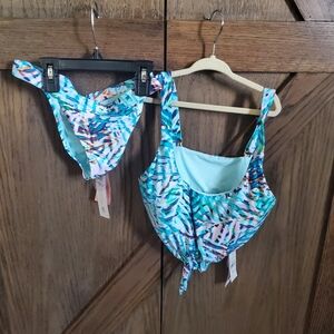 Stylish nwt pilyq bikini set with a tropical print. tie front knot halter size d or size large. bottoms medium.