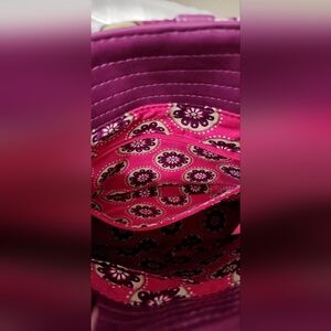Add a pop of color to your outfit with this vibrant pink and purple women's bag by Vera Bradley. It is an excellent pre-loved condition. I do not see any obvious call-outs. The purse has an inside zipper pocket and other pockets for storing necessary items to get too quickly. I love the pink and purple colors that are blended together along with a touch of lime green and white. The single strap is nice and wide to make it comfortable on your shoulder and also is made in a way that it will not slip off your shoulder easily.