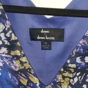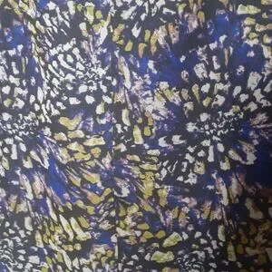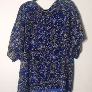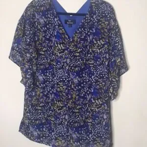 royal blue with mesh print. flowy style and flowy short sleeves. purple-blue lining. good condition has some runs in the lining on the inside. vneck in the front and the back. polyester.