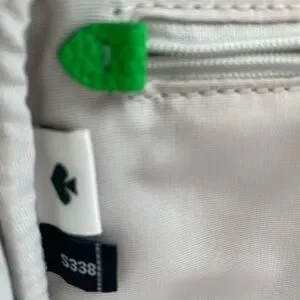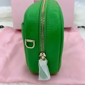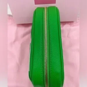 On trend Green Jay green pebbled leather, faille lining, pin mount gold tone metal logo. Interior zip pocket, slip pocket on back.