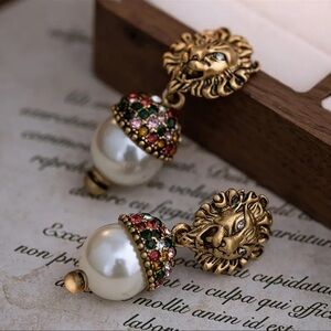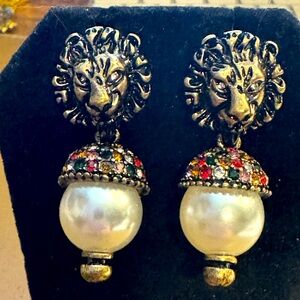 Designer Inspired Lion Head with Faux Pearl & Colorful Rhinestones Earrings