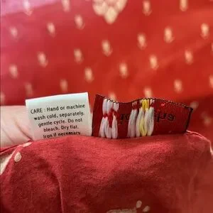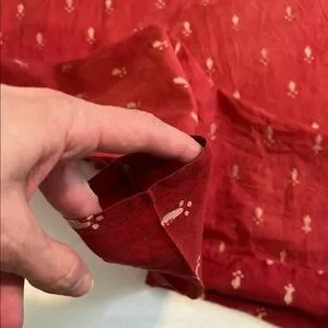 Elegant red curtain with white patterns. Lightweight and stylish. Natural variations in material. One looks like a great fish!