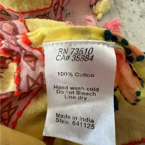 Ivy Jane colorful blouse with cap sleeves. V-neckline with embroidery down front of blouse and around the designs throughout the fabric. Tassels line the whole hem. Perfect for Spring and Summer!So pretty and lightweight