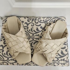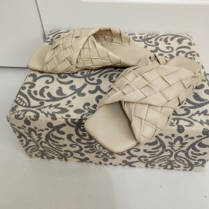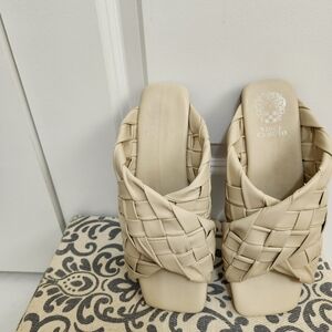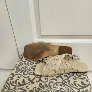 These are stylish flats for the summer. Slide into the Anella sandal from Vince Camuto. The woven braided crossover is the perfect bohemian vibe. Great sandal for resort and vacation activities. They are extremely fashionable and comfortable. The modern square toe will add a little flare to your outfit. In excellent pre-loved condition.