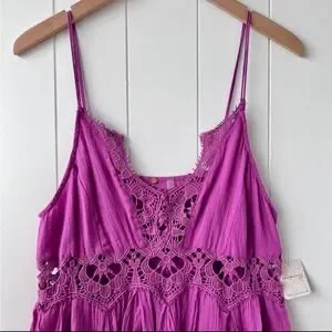 Free People purple mini dress. Features lacey crochet detailing. Flowy and stylish. Worn once and washed once. Hung to dry. Well taken care of. I bought it specifically for one Lainey Wilson concert. Excellent condition! Smoke free home storage. Fast shipping. Day of sale or day after if sold on Sunday.