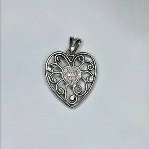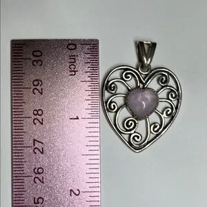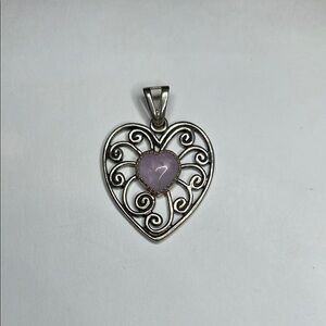 This exquisite heart-shaped pendant showcases a captivating purple stone at its center, surrounded by intricate silver filigree. The ornate design exudes a vintage charm, making it a timeless addition to any jewelry collection.