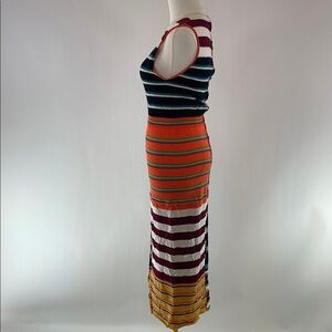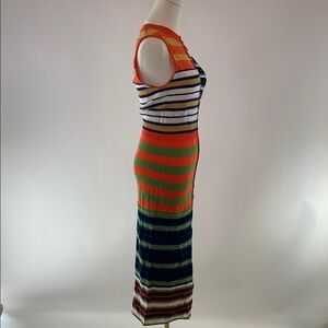 Multicolor stripe knit (100% Virgin Wool). Sheath. Sleeveless. Crewneck. Pull on. 48" from shoulder to hemline. Imported
