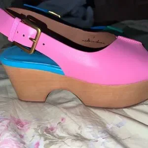 Bold slingback platforms by Charlotte Stone. Features vibrant pink, blue, and green hues. Ideal for a standout look.
