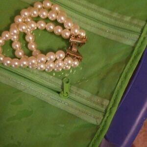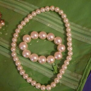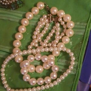 4 piece costume pearl necklaces 2 and 2 bracelets. Great Gatsby theme, Multi bracelet and other one stretches. Thin pearl necklace stretchy too.