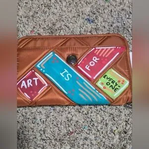 Brown wristlet with vibrant art design. Features colorful geometric patterns.