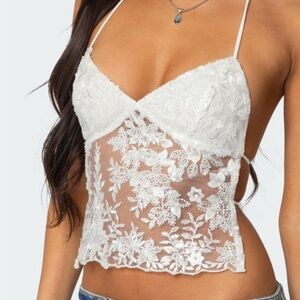 This elegant white lace halter top is perfect for any occasion. The intricate lace design adds a touch of sophistication. Pair it with your favorite jeans or skirt for a chic look. WORN ONCE