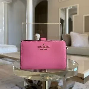 This elegant Kate Spade wallet in a vibrant pink hue features a structured rectangular design with a smooth saffiano leather finish. The wallet is adorned with the iconic Kate Spade logo on the front, adding a touch of sophistication to your accessory collection. Its compact size and sleek metal clasp closure make it a perfect choice for both everyday use and special occasions.