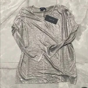 This relaxed-fit blouse from Avant Toi features a striking graphic design in a shimmering silver hue. The long sleeves and fluid fabric create a sophisticated yet casual look, perfect for adding a touch of elegance to any ensemble.BBB