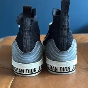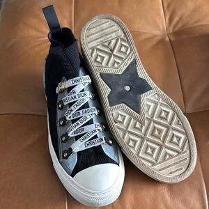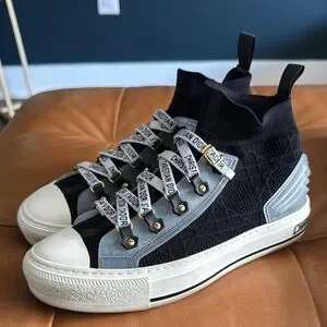 Chic Dior high-tops with black and white design. Features signature detailing. Perfect for casual style.