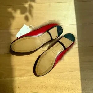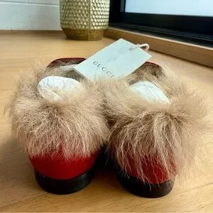 Gucci Red Leather Flats with Brown Lamb Fur and Gold Hardware