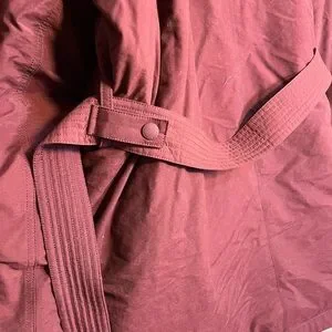 Experience ultimate warmth and style with this Eddie Bauer burgundy puffer jacket. Designed with a belted waist for a flattering fit and a cozy hood for added protection, this jacket is perfect for braving the cold in style. All measurements are approximate.