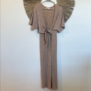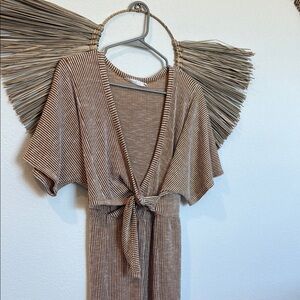 This stylish jumpsuit from All in Favor features a sophisticated tan and white striped pattern, perfect for making a statement. The design offers a flattering silhouette with a comfortable fit, ideal for both casual and semi-formal occasions. Its elegant style ensures you stand out effortlessly.