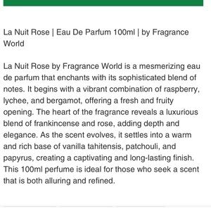 Fragrance World La Nuit Rose Edp begins with a gentle solo played by the honey overtones of a grainy pear. The heart of the perfume plays with subtle undertones of a regal vanilla orchid, framed in a fragrant play of black rose. The finale of the oriental gourmand melody has smoky accents of enveloping incense and sweet nuances of strawberry lychees intertwined with balsamic patchouli and delightful hints of praline with a bitter-spicy papyrus aftertaste.