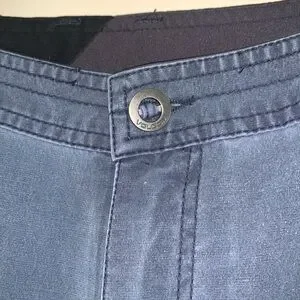 These Volcom shorts feature a sleek flat front design in a classic blue/gray color, perfect for a relaxed and stylish look. Crafted for comfort and versatility, they are ideal for warm weather outings. Cool Volcom button closure. See pic for a tiny pull on front right side.
