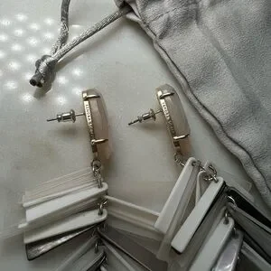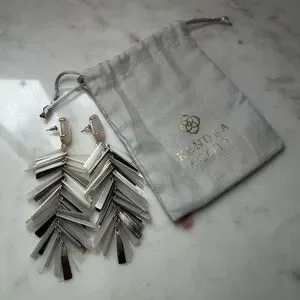 These Kendra Scott earrings showcase a striking geometric cascade design in elegant silver and white tones. Crafted with layered, angular pieces, they create a dynamic play of light and shadow, making them a bold statement piece. Perfect for adding a touch of architectural flair to any ensemble.