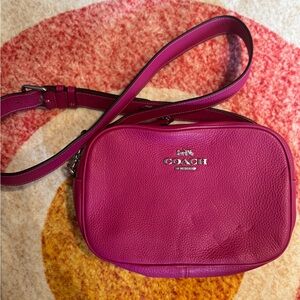 This Coach crossbody bag in a striking pink hue is crafted from premium leather, offering a sleek and structured design. Its compact size and adjustable strap make it a versatile accessory for any outing, while the subtle logo on the front adds a touch of elegance.