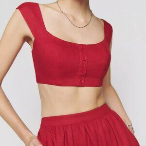 Chic two-piece set in vibrant red. Cropped top with matching flowy skirt. Ideal for stylish outings.