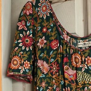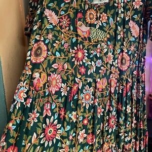 This NATURAL LIFE Maxi Dress features a striking green base adorned with vibrant pink florals and bird-patterns, perfect for a casual day out. The maxi length and short sleeves offer a relaxed fit, while the scoop neck adds a classic touch. Crafted from a lightweight fabric, it ensures comfort and effortless style.