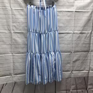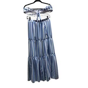 Summer Beachy 2 piece Blue White Stripe Bandau top sheer tiered skirt Size Large