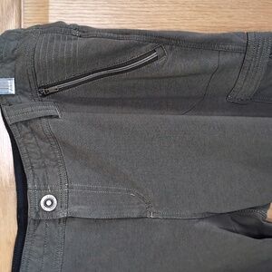 Super soft, stylish and versatile olive cargo pants by Kuhl for women. Fabric is 63% cotton, 31% polyester, and 6% spandex. Elastic drawstring in waistband, and five zipper pockets. Perfect for casual outings or outdoor adventures. EUC.